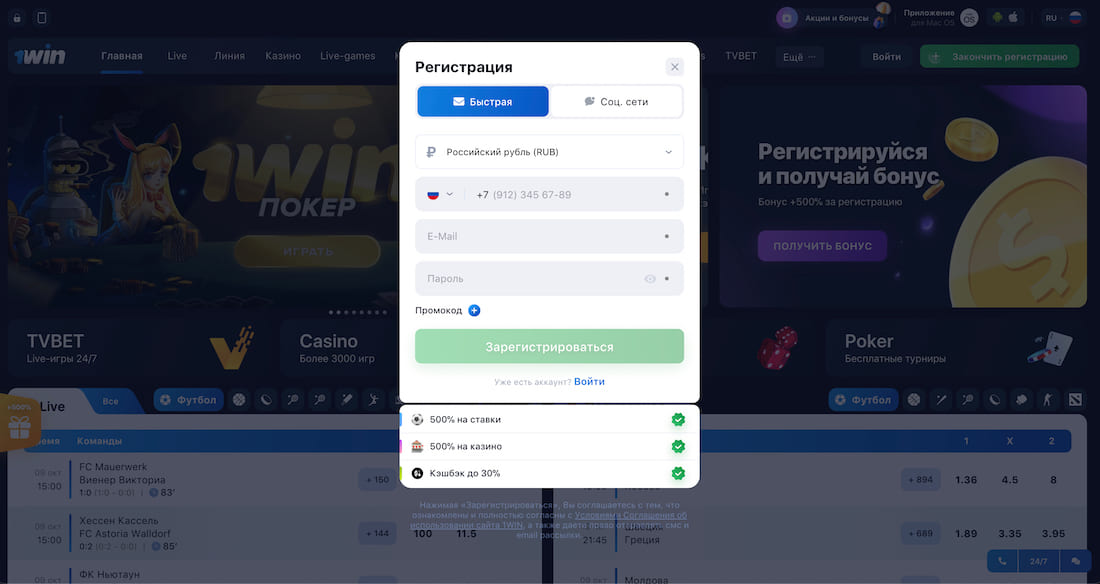 Официальный сайт 1 вин предлагает пройти регистрацию следующим образом: